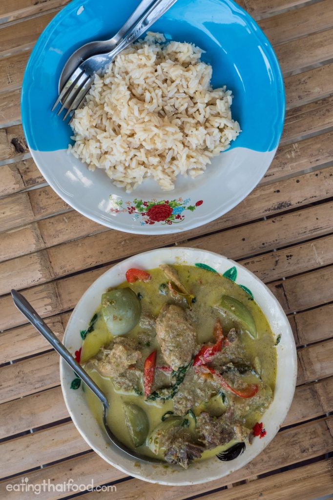 One of the best things to remember to do when you’re in the middle of making Thai green curry, is to make sure you start cooking a pot of rice. That way as soon as your curry is ready, you’ll be ready to eat it along with rice.
