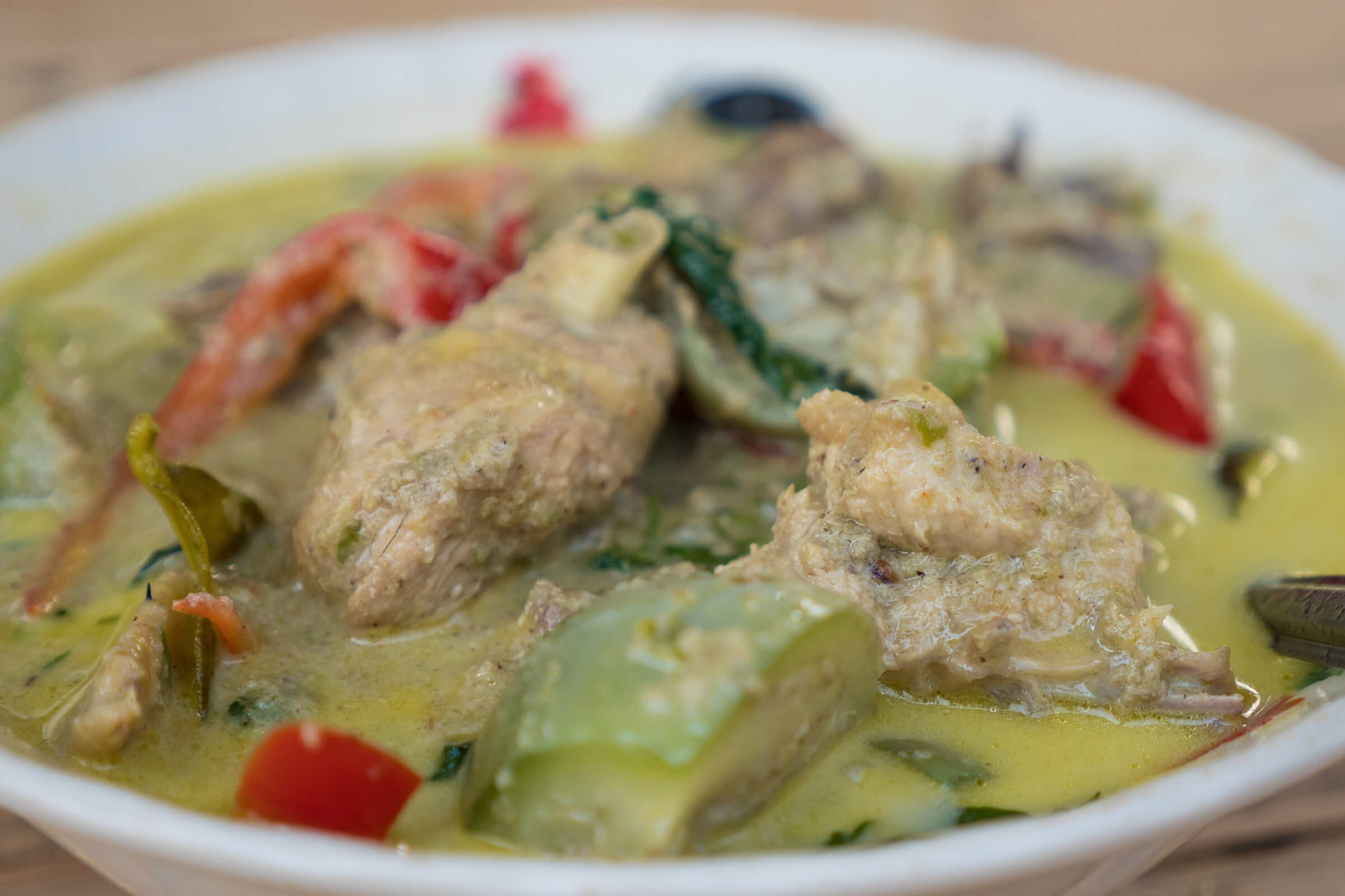 Green curry (แกงเขียวหวานไก่) is a very common Central Thai dish that is made with a base of curry paste that gets its green color from Thai green chilies.