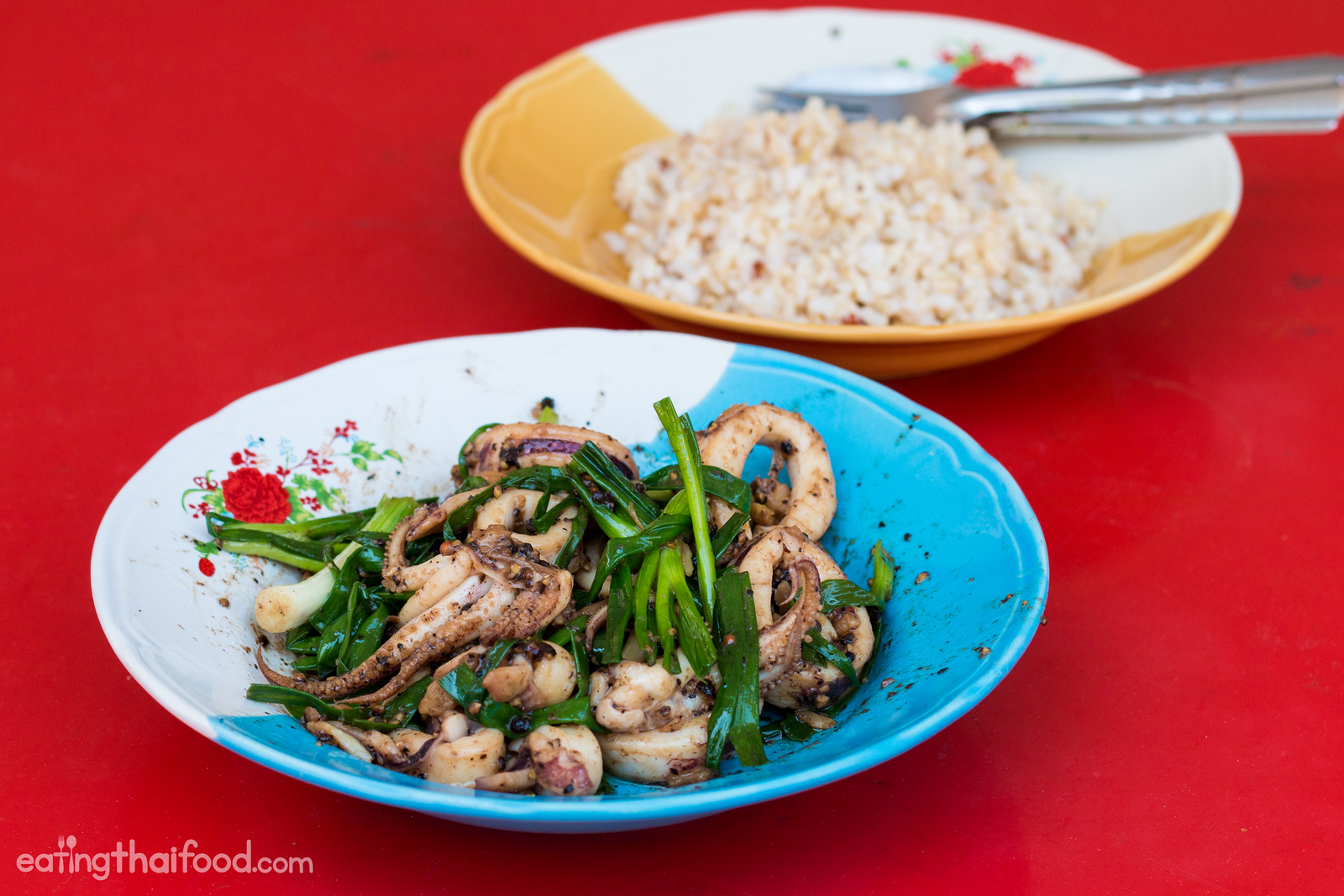 A dish called meuk kapi prik tai dam (หมึกกะปิพริกไทยดำ), squid fried with shrimp paste and black pepper.