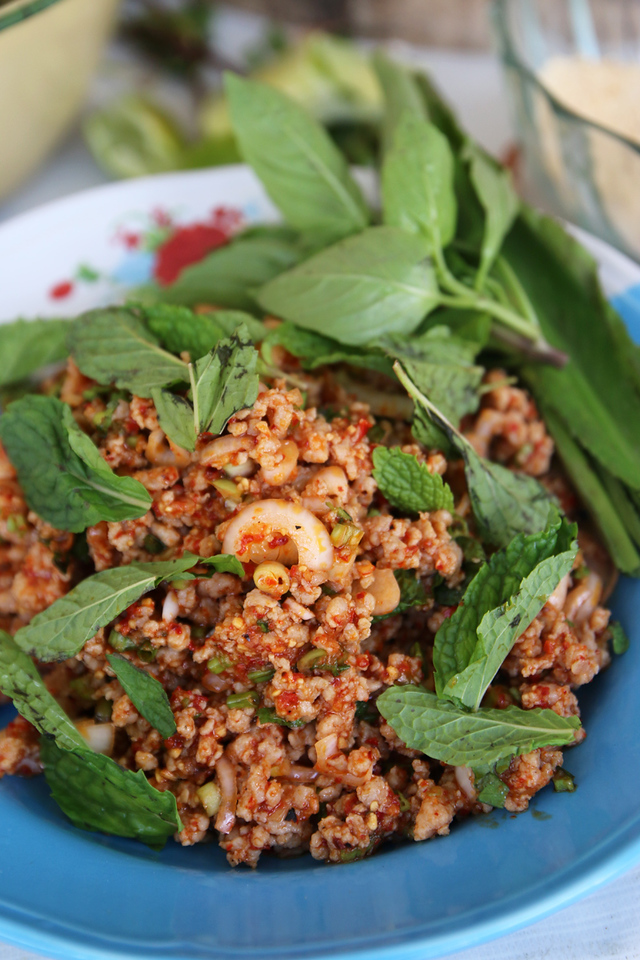 - Give the larb moo a good mix, making sure all the spices and dressing coats the pork.