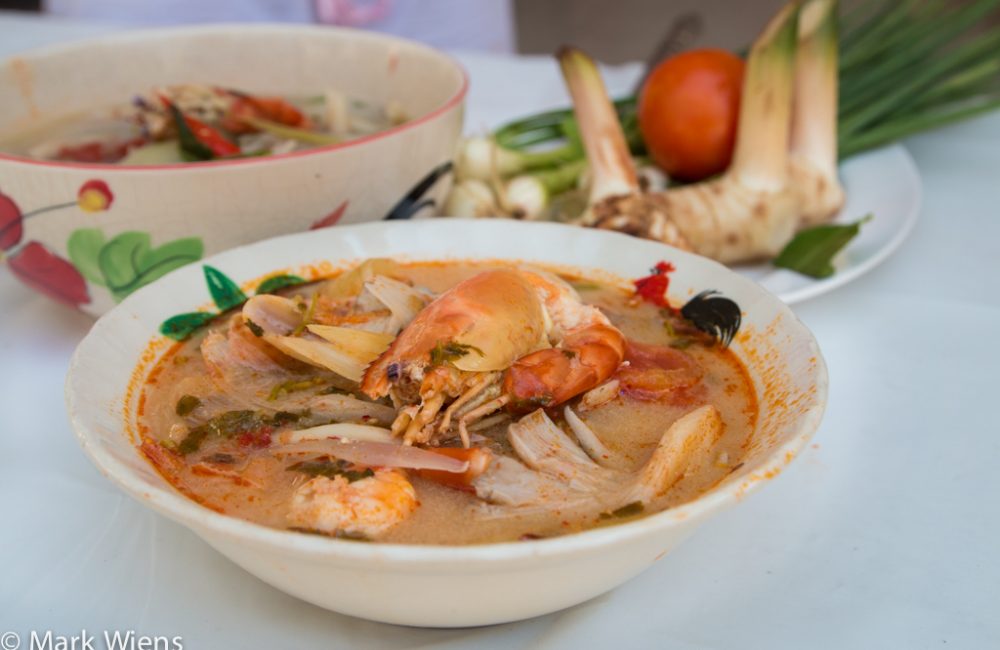 Tom kha gai (ต้มข่าไก่) is not like southern Thai gaeng som, which is supposed to be extremely spicy. Instead it’s typically a very mild dish in Thailand.