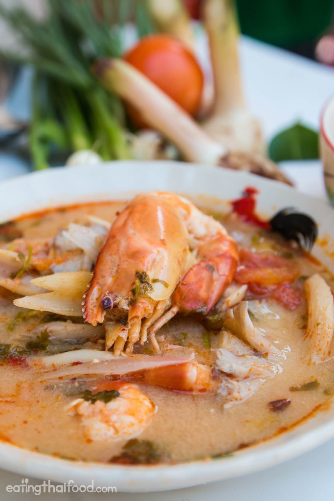 Contrary that many people think tom yum is made creamy with coconut milk, it’s actually nom kream tiam (นมครีมเทียม), which is canned evaporated milk (as opposed to sweetened condensed milk).