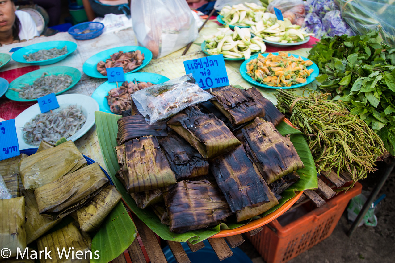 The fish, mixed with ground Thai herbs and spices, was wrapped in a couple layers of banana leaves, folded into a packet, and grilled on the side of the road at the market.