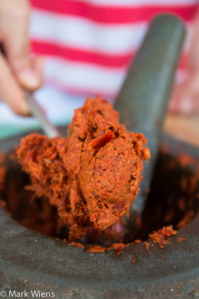 It’s best to first pound the chilies and salt until quite fine and the oils are fully released from the chilies (about 5 – 10 minutes).