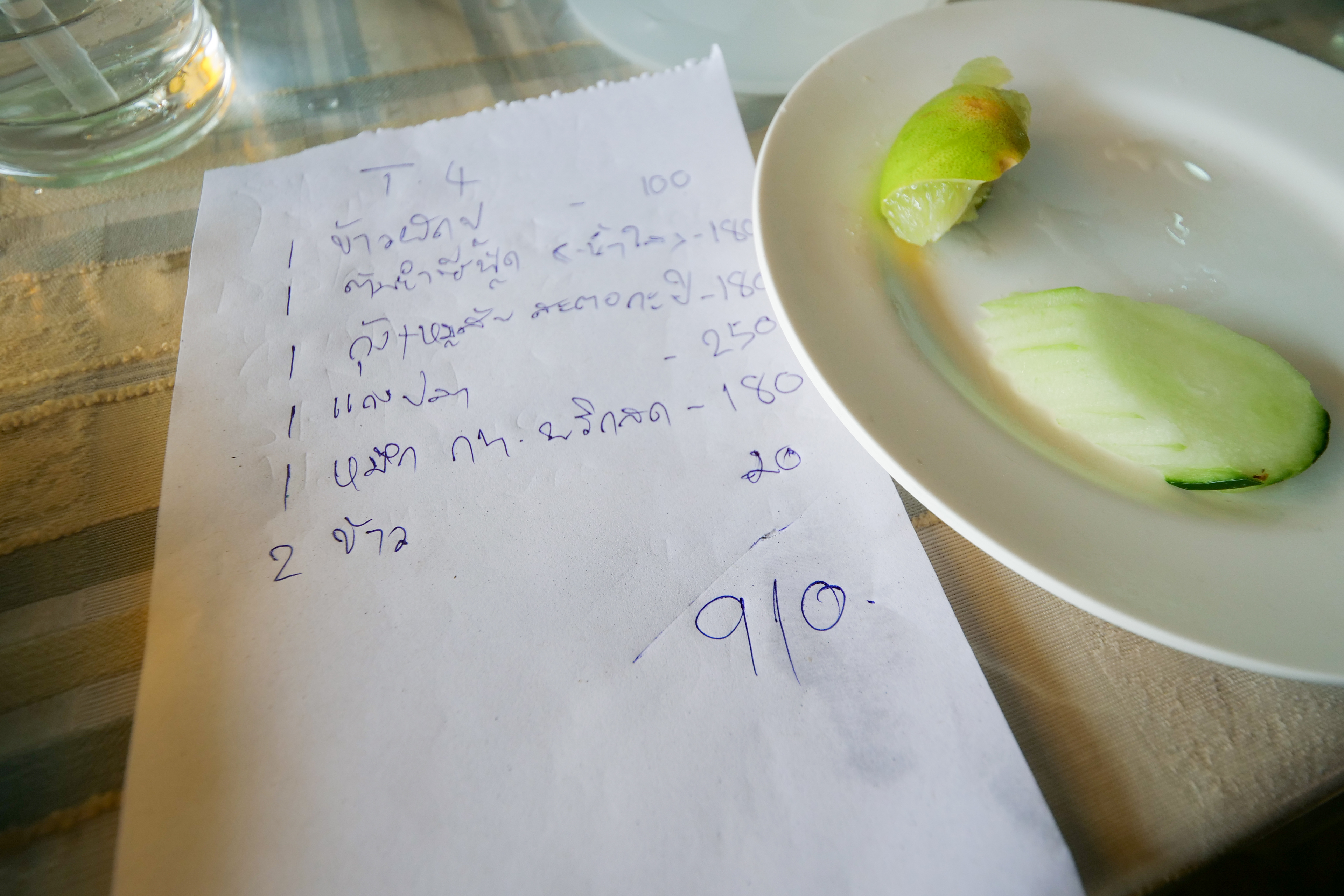 Total price came to 910 THB ($28.95 at the time of writing this), which is reasonable for the seafood we ate, the quality, and the portion sizes are also pretty good size. Also included in our bill (but not pictured in this article), my son got the crab fried rice (khao pad boo ข้าวผัดปู), which was fantastic – I had a few bites!