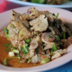 We ordered a couple bowls of fish noodles and fishballs, kuay teow sen pla (ก๋วยเตี๋ยวเส้นปลา). The noodles were thick, and had a texture similar to bean curd, but I believe they were all fish.