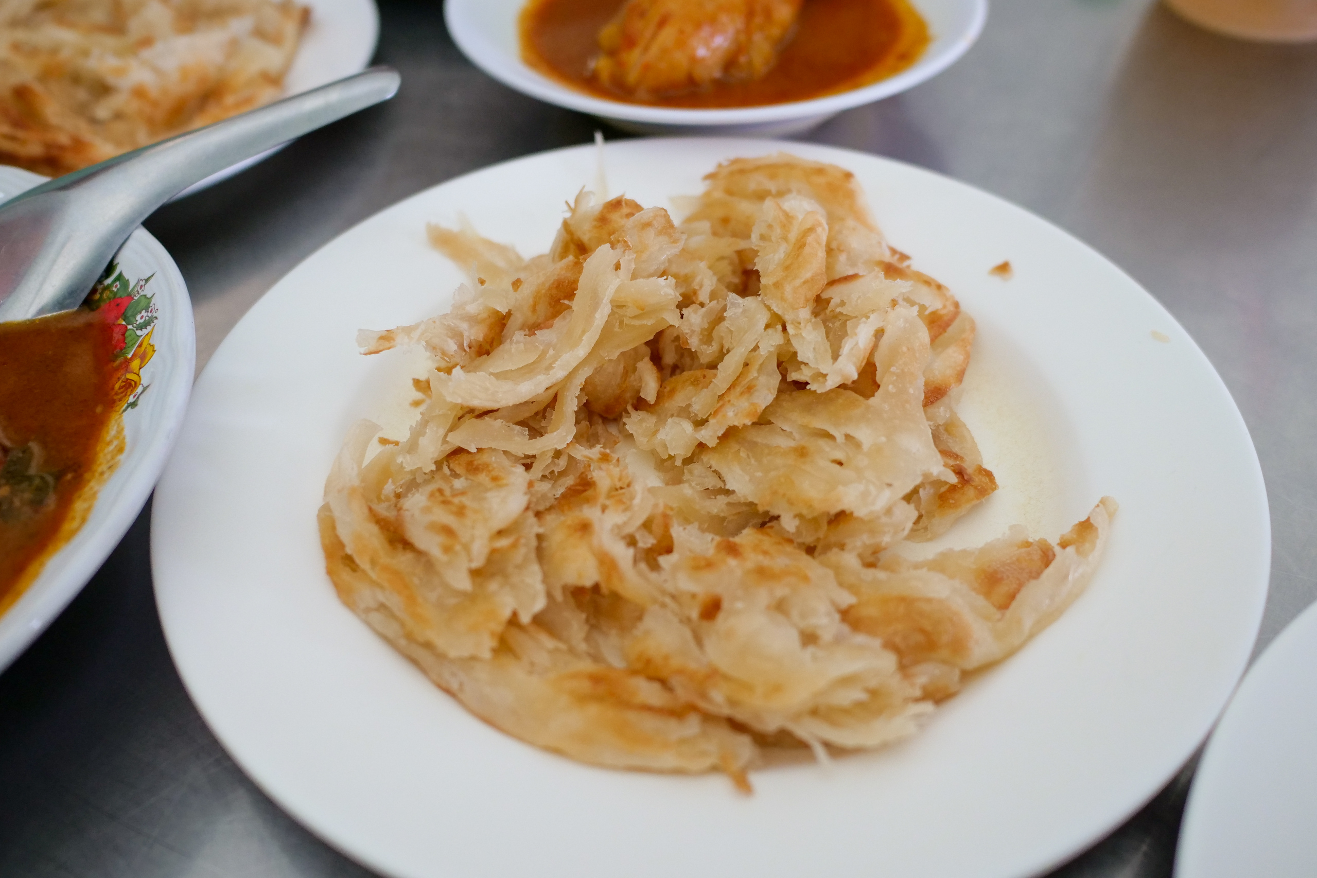 So first, the roti. It’s flaky, crispy on the edges, and gooey in the center. It comes shredded, which enhances the crispiness.